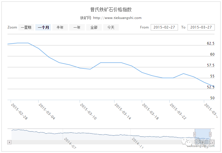 普氏指数Platts 62%:53 (-1),月均价57.58;